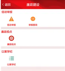 包含“信访举报”、“廉政视点”、“以案学纪”三个板块。“信访举报”可以直接填写被举报人的姓名、职务以及举报原因等内容,便于职工通过APP进行信访举报;“廉政视点”主要展示廉政相关要求等内容,“以案学纪”通过对典型案例的解读,教育干部职工廉洁自律、拒腐防变,着力打造一个公正透明、高频互动、全员监督的新格局。