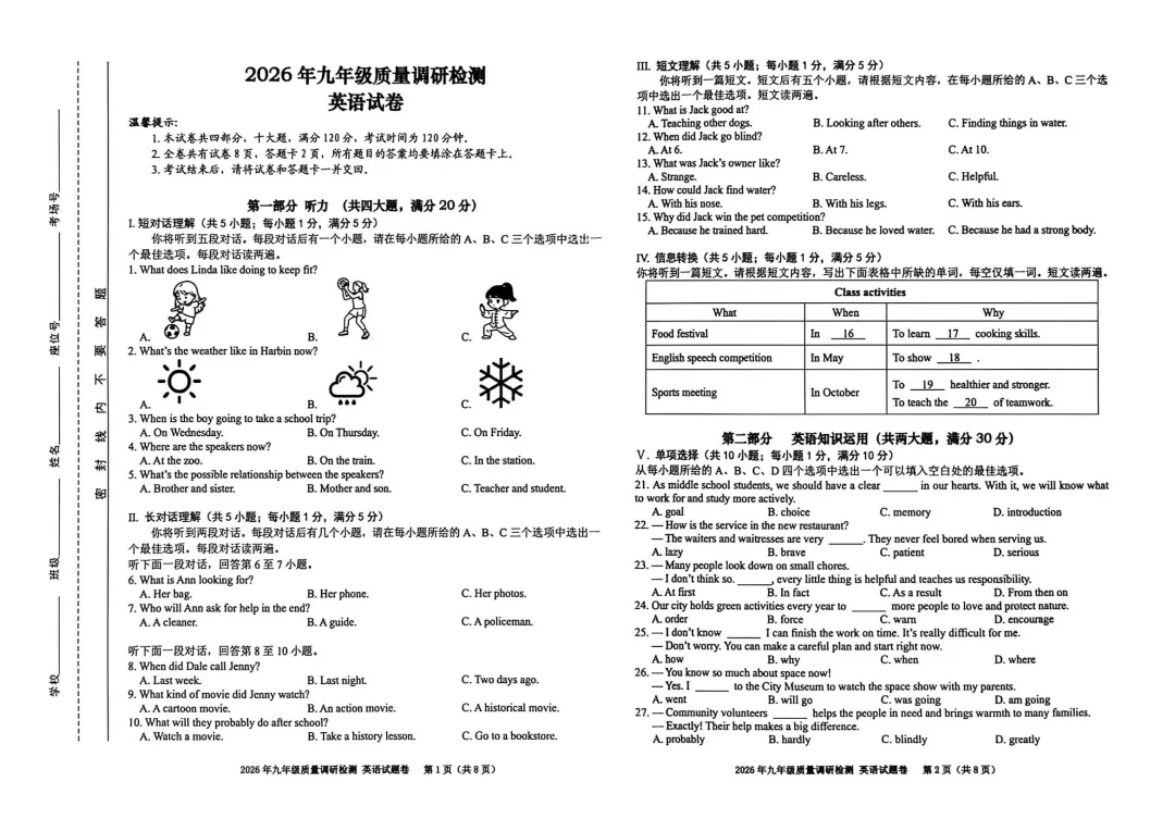 2026瑶海区中考一模部分试卷预览