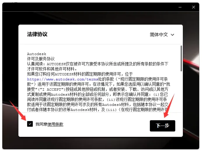 3、点击勾选【我同意使用条款】,然后点击【下一步】。