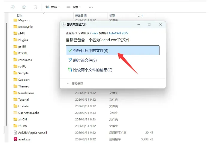 10、在安装路径下粘贴前面复制的【acad.exe】文件,选择【替换目标中的文件】。