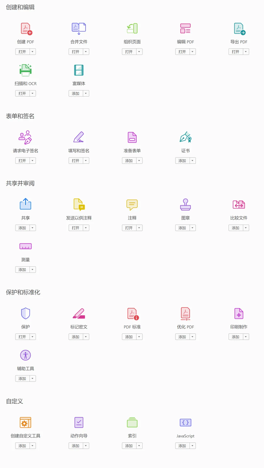 在工具选项中可以看到,它所包含的功能非常全面,可以对PDF文件进行创建、合并、编辑、扫描、签名、注释、比较、加密保护等。