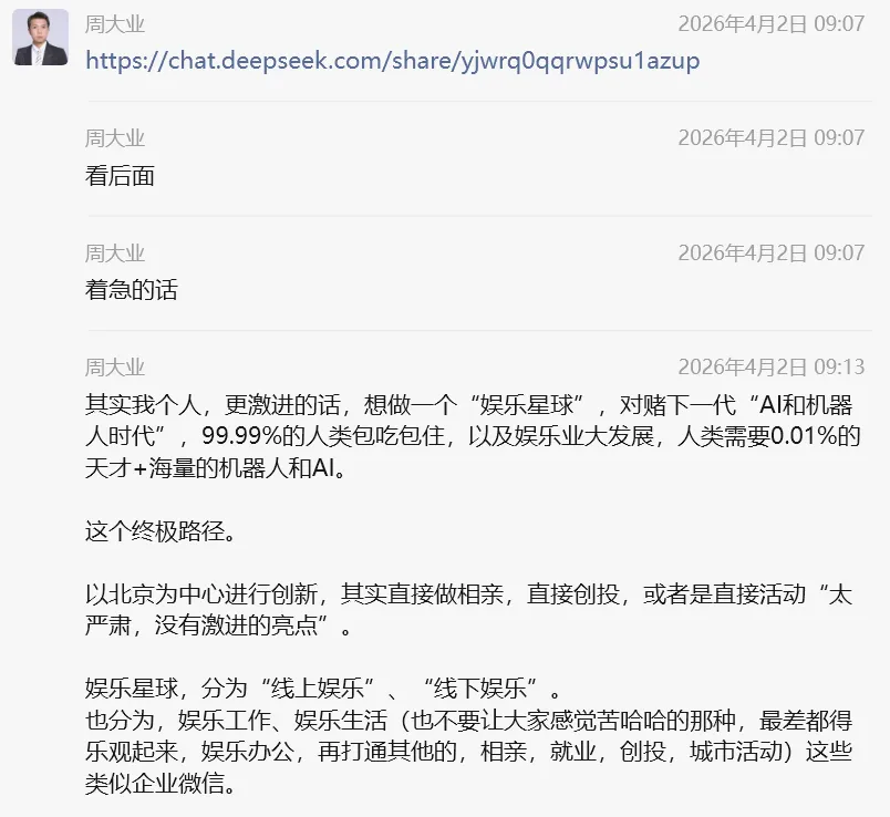 虽然我2017年很早写下“天天过节”的科幻,包括那时候要做“节日星球、娱乐星球”的起点,现在AI和机器人时代更是必然。