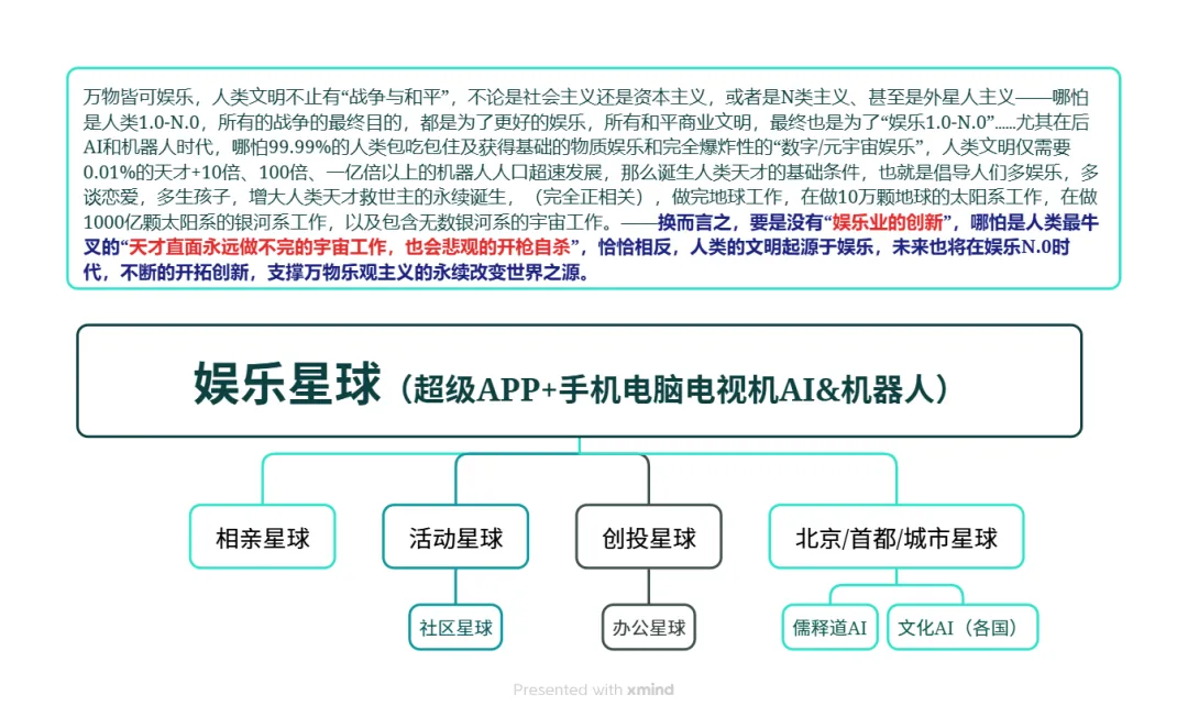 总之经过无数年的积累,最后发现所有这些产品、所有这资源,都可以大统一为一个超级APP“娱乐星球”,以及超级手机电脑电视机操作系统和AI和机器人。
