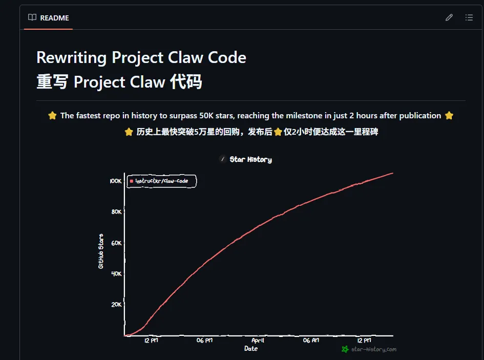 github上发布后几个小时,claw-code冲破5万Star,打破了GitHub历史纪录。