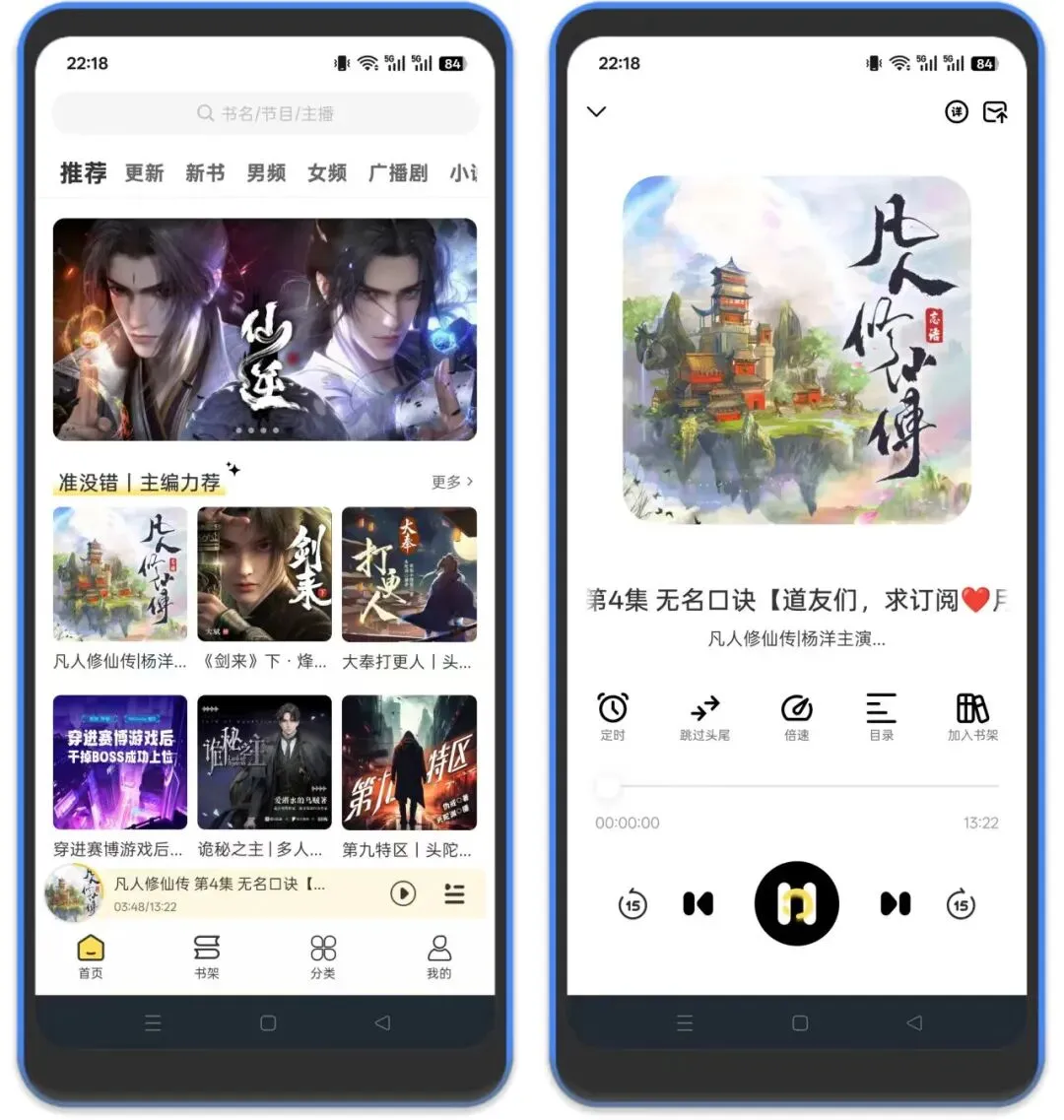 1、一款主打完全免费、无广告、资源海量的听书神器,免登录即可使用,并提供丰富的个性化播放功能。全部都是真人朗读,支持定时,倍速,跳过片头片尾等功能。