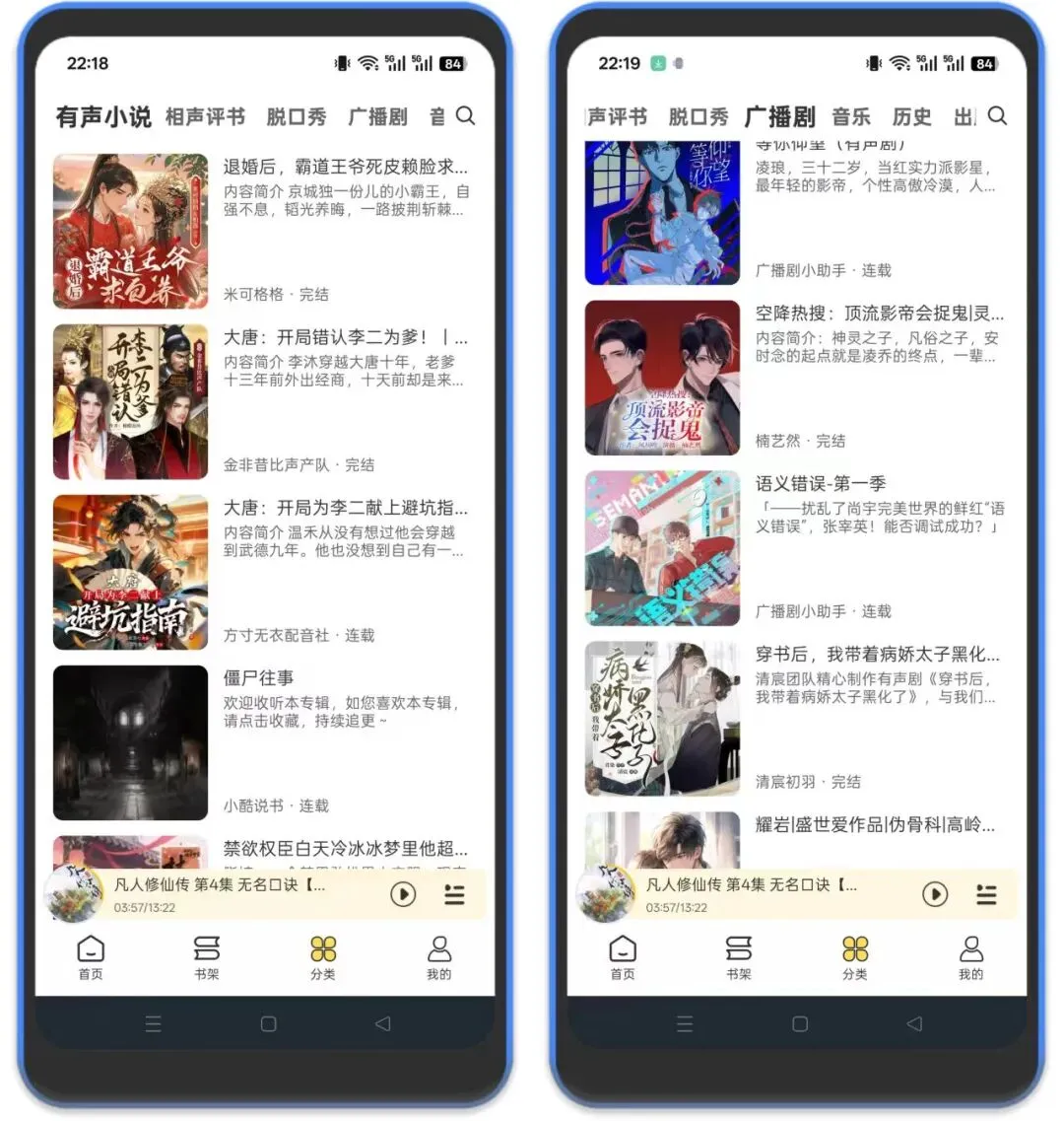 2、聚合全网有声资源,涵盖有声小说,相声评书、脱口秀、儿童故事、历史人文、知识讲座等,打开即听,资源丰富,也可以直接搜索,稳定用了一段时间了,挺不错的!