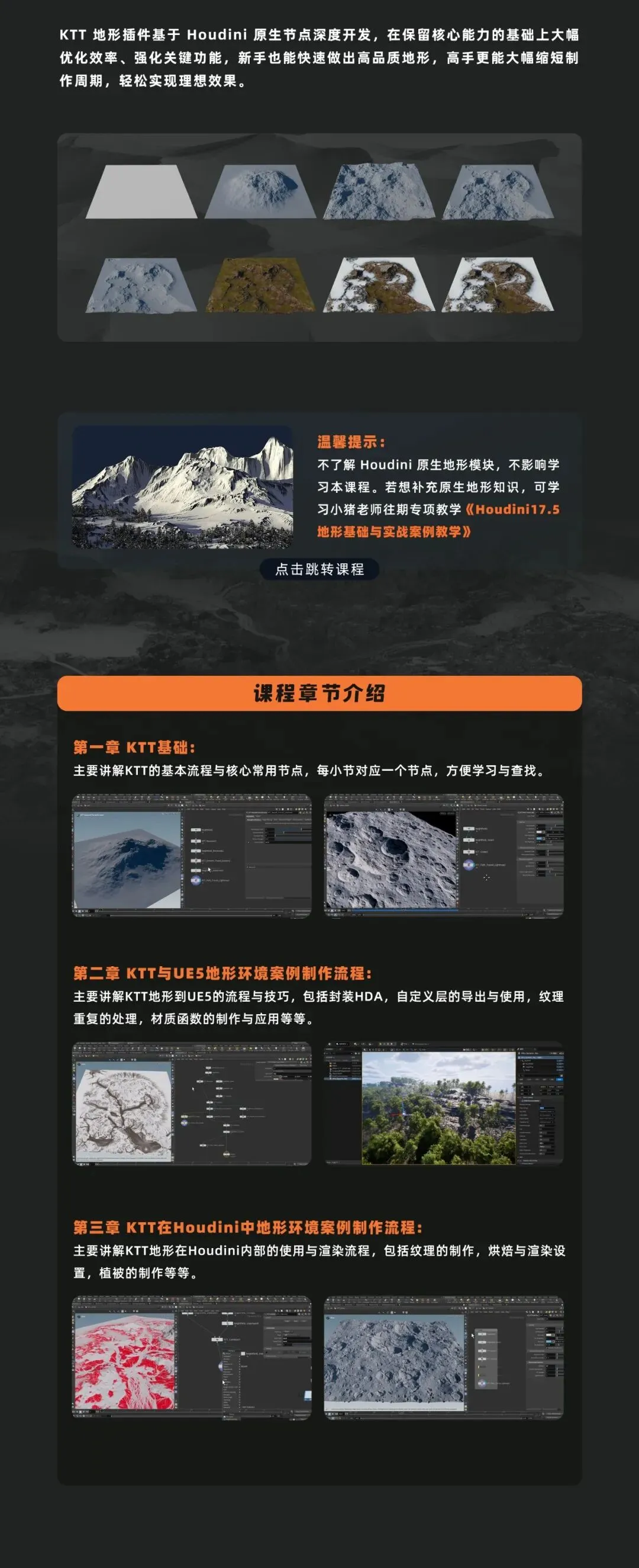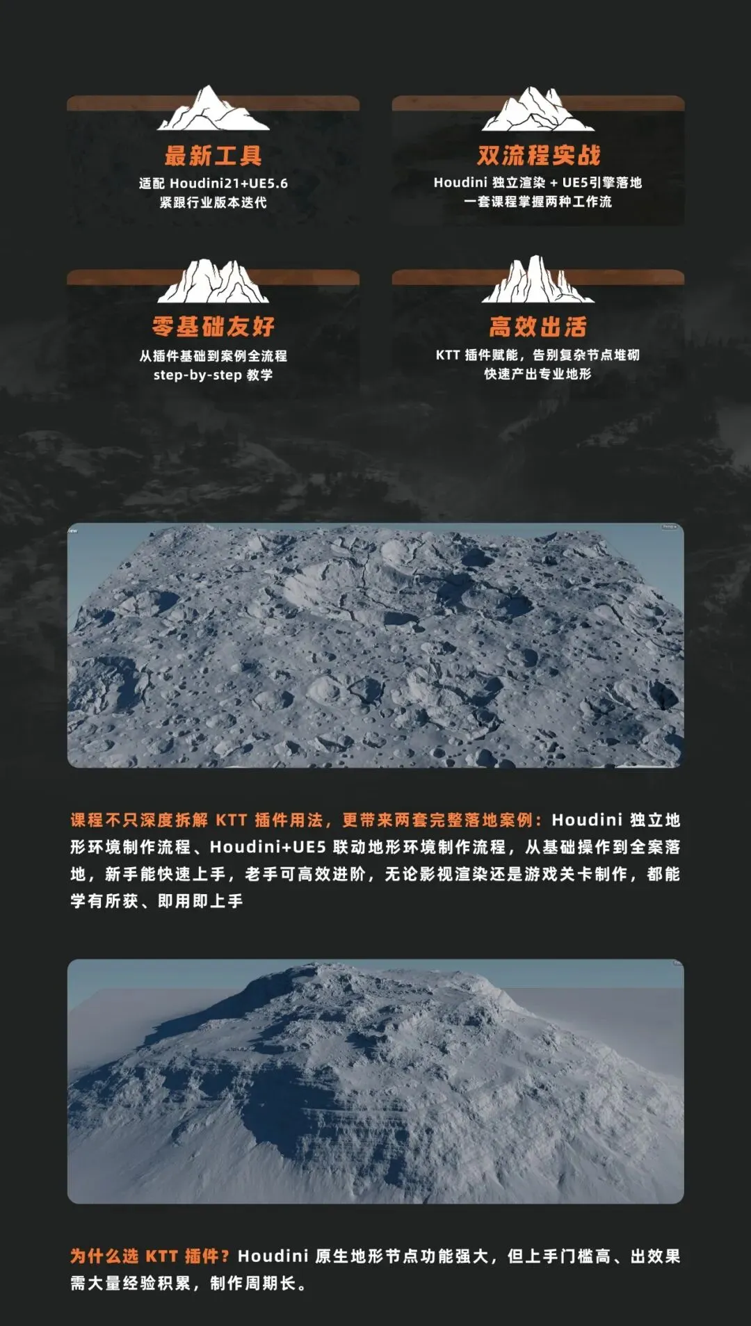 分别是Houdini中制作地形环境的流程,和Houdini结合UE5制作地形环境的流程。通过本课程的学习,无论您是新手还是老鸟,无论您是影视向还是游戏向都能收获满满。