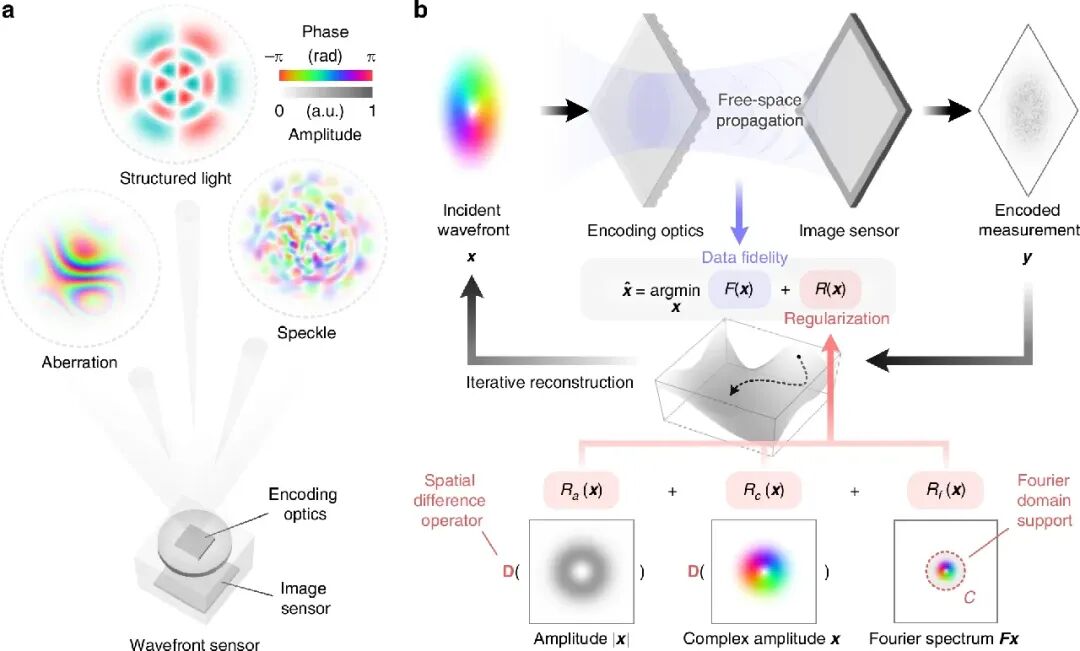 针对这些困扰领域数十年的痛点,研究团队跳出传统思路,回归光场本身的物理本质,利用绝大多数波前 “空间分布平滑、能量集中于低频” 的固有先验,构建了空间与傅里叶域联合正则化的计算框架,从根本上解决了单次曝光相位反演的病态问题,实现了通用、高效、紧凑的复杂光场波前传感。