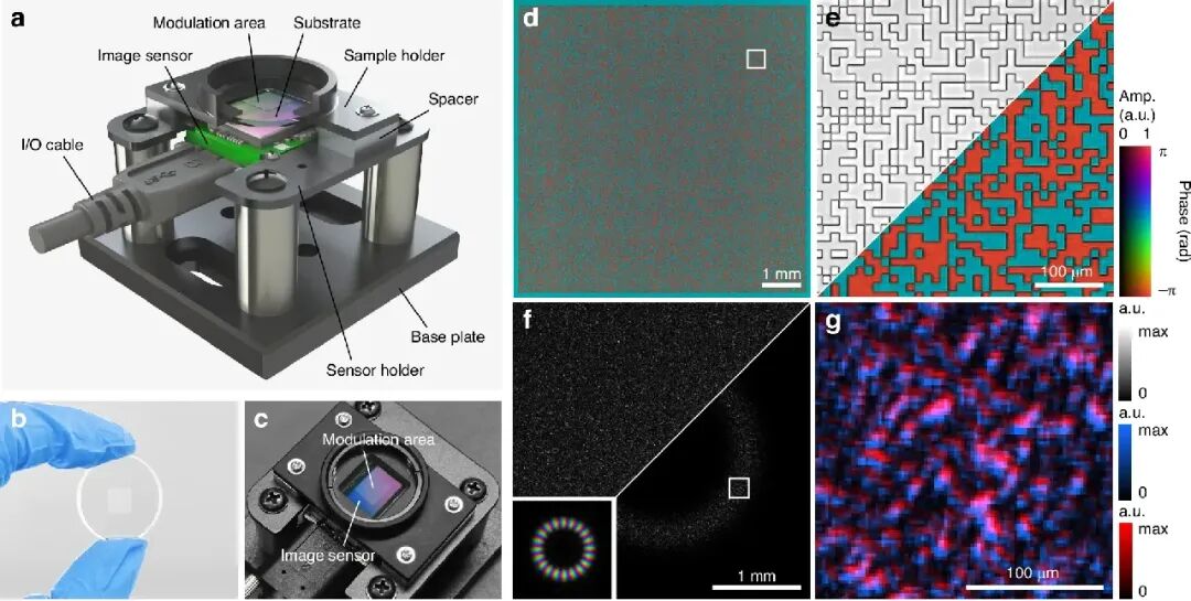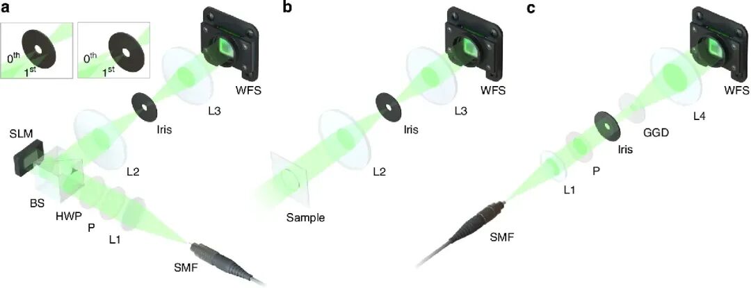 子图 b(振幅样品表征装置):用于测试传感器的振幅成像能力,将 SLM 替换为透射式振幅样品。子图 c(散斑场表征装置):通过毛玻璃生成复杂散斑场,在傅里叶平面进行波前测量。