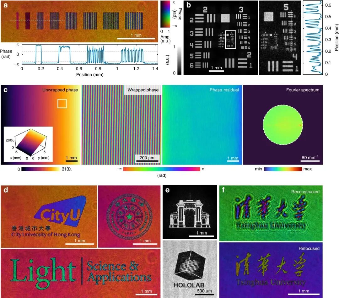 子图 b(振幅分辨率测试):成功解析了 1951 USAF 分辨率靶的第 5 组第 6 号元素,对应线宽 8.77 μm,与理论分辨率一致。