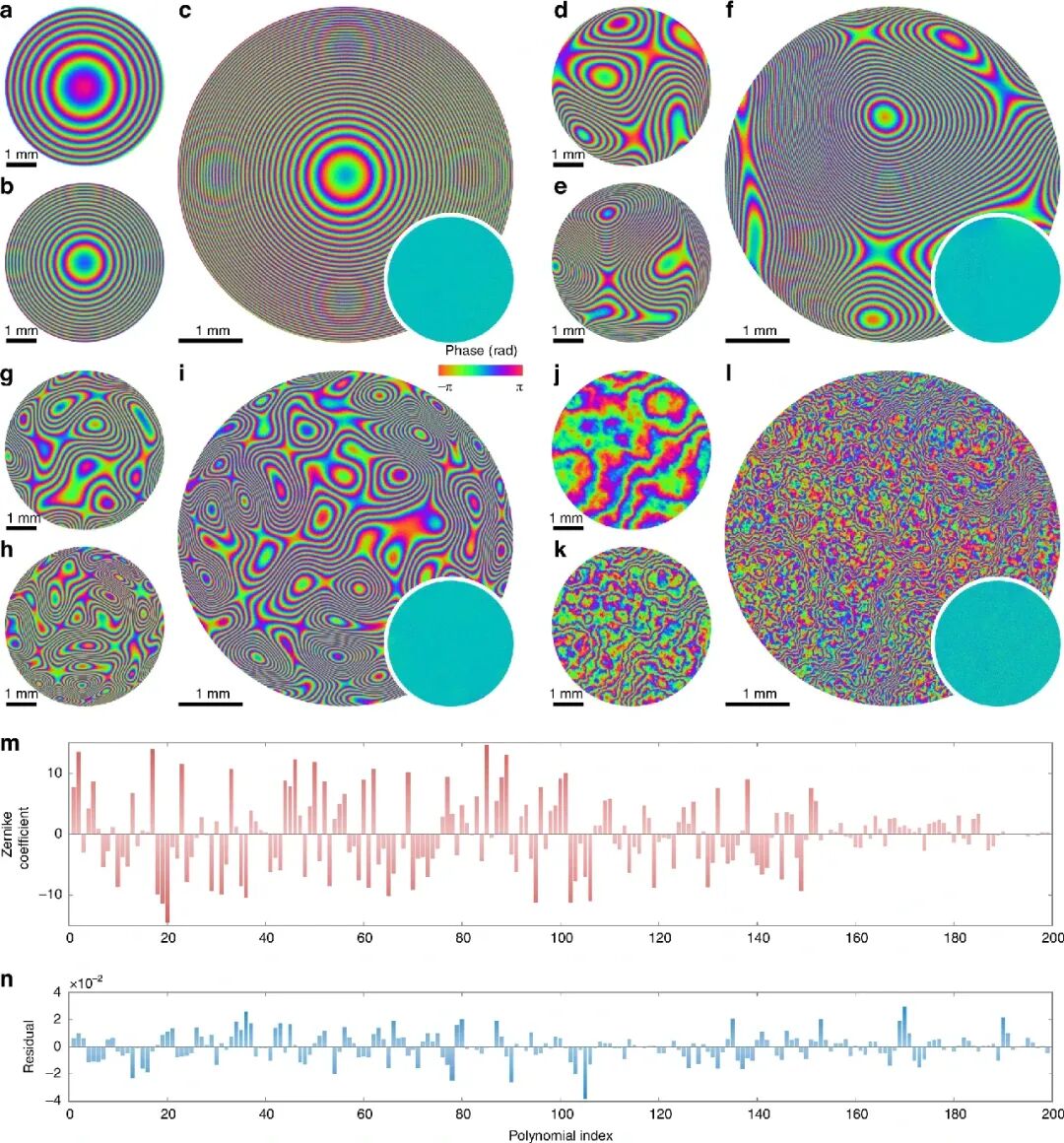 子图 g-i(高阶像差重建):成功重建了包含多达 200 个泽尼克模式的复杂像差,m-n 图为前 200 阶泽尼克系数的分解结果与残差。