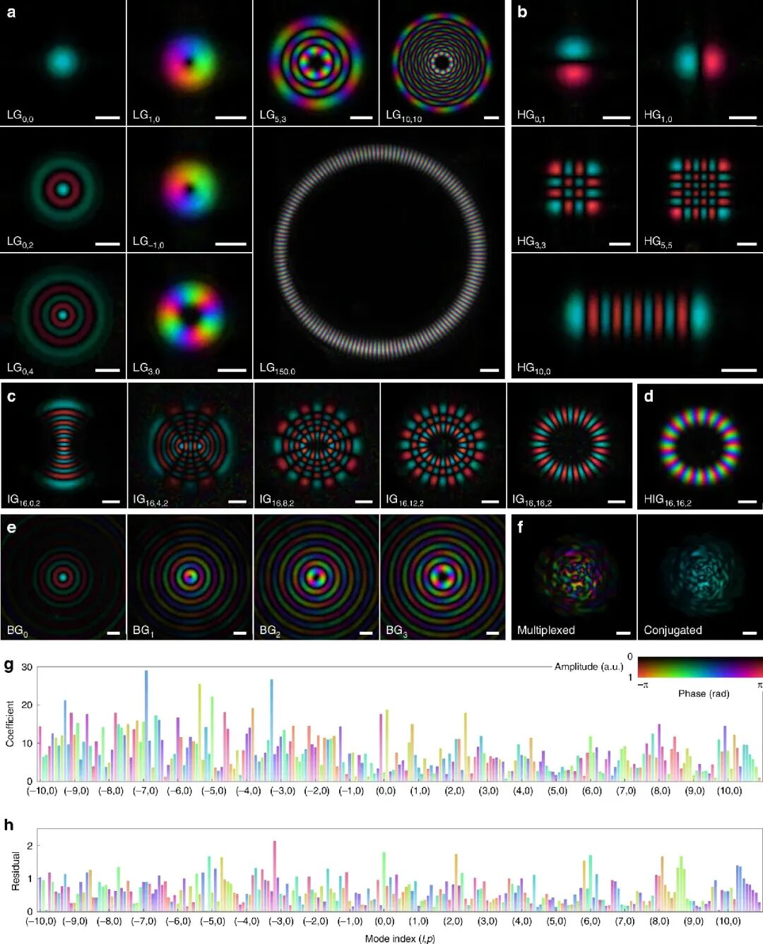子图 g-h(模式分解结果):展示了复用光束的模式系数幅值、相位及残差,强度相关系数达到 0.9927。
