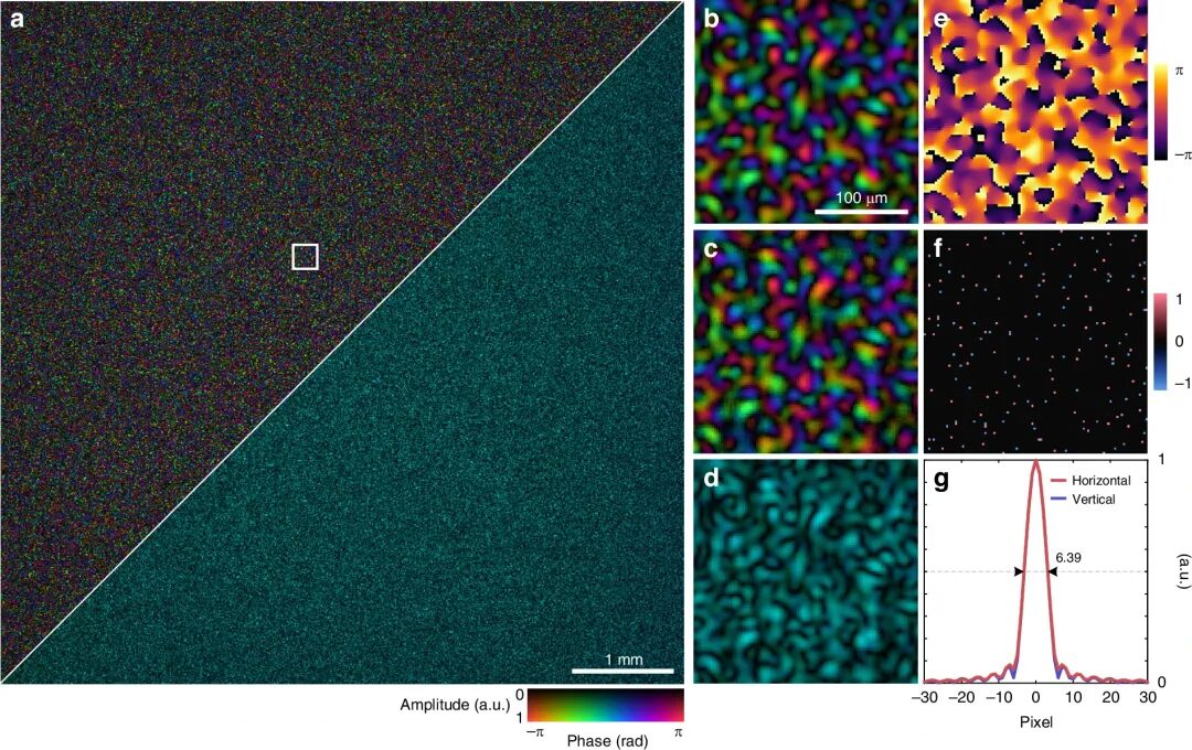 子图 f(拓扑电荷图):自动提取并可视化了散斑场中所有的相位奇点。
