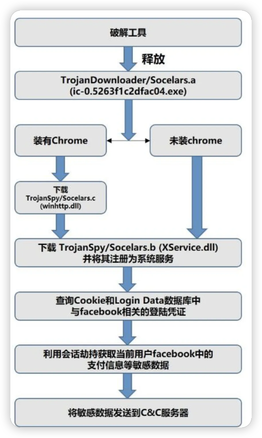 近日,火绒安全团队截获病毒”Socelars”,正通过KMSpico、AdobePhotoshop等四十余款软件破解工具进行传播。该病毒会利用被感染用户的社交网站临时登录凭证,专门窃取用户当前绑定的信用卡账户信息。