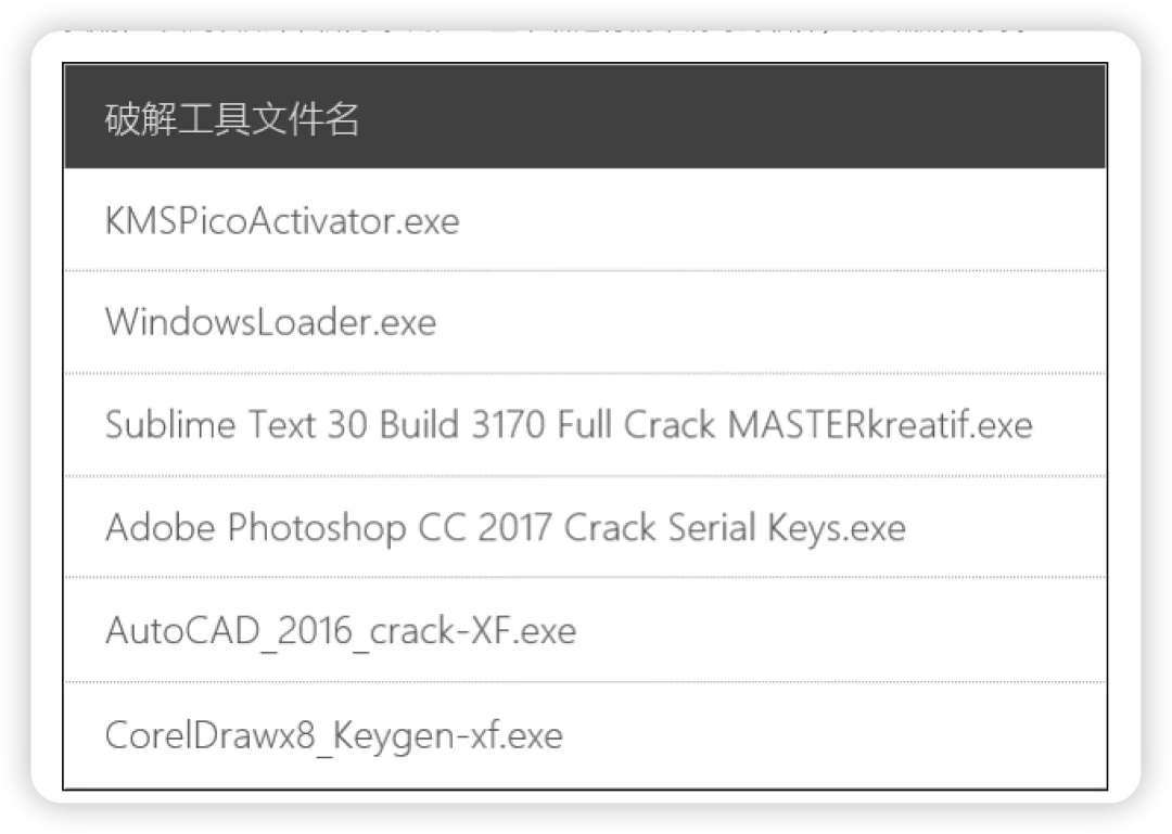 该病毒被植入在KMSpico、WindowsLoader等四十余种破解工具中,具体带毒破解工具列表如下图所示。用户一旦下载运行携带病毒的软件,就会激活病毒,在以下工具里比较常见:
