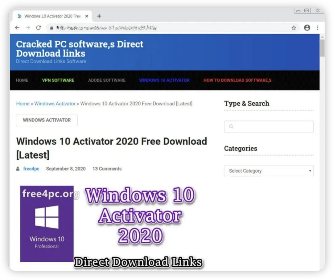 通过访问伪造的破解软件下载站点、YouTube视频及BT种子,借此分发恶意软件。例如:XX恶意Windows 10激活器页面。