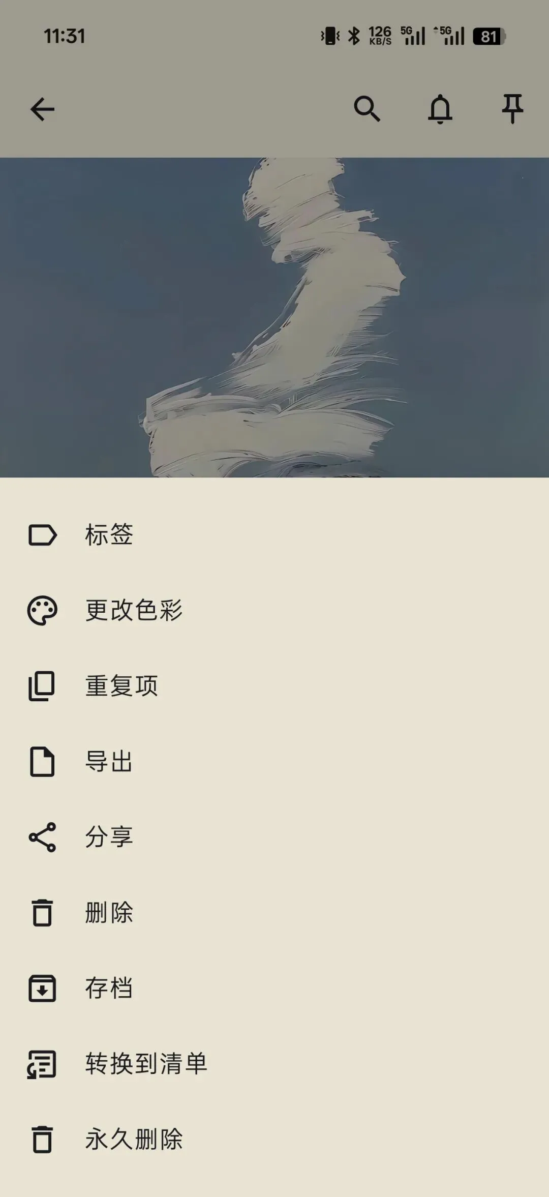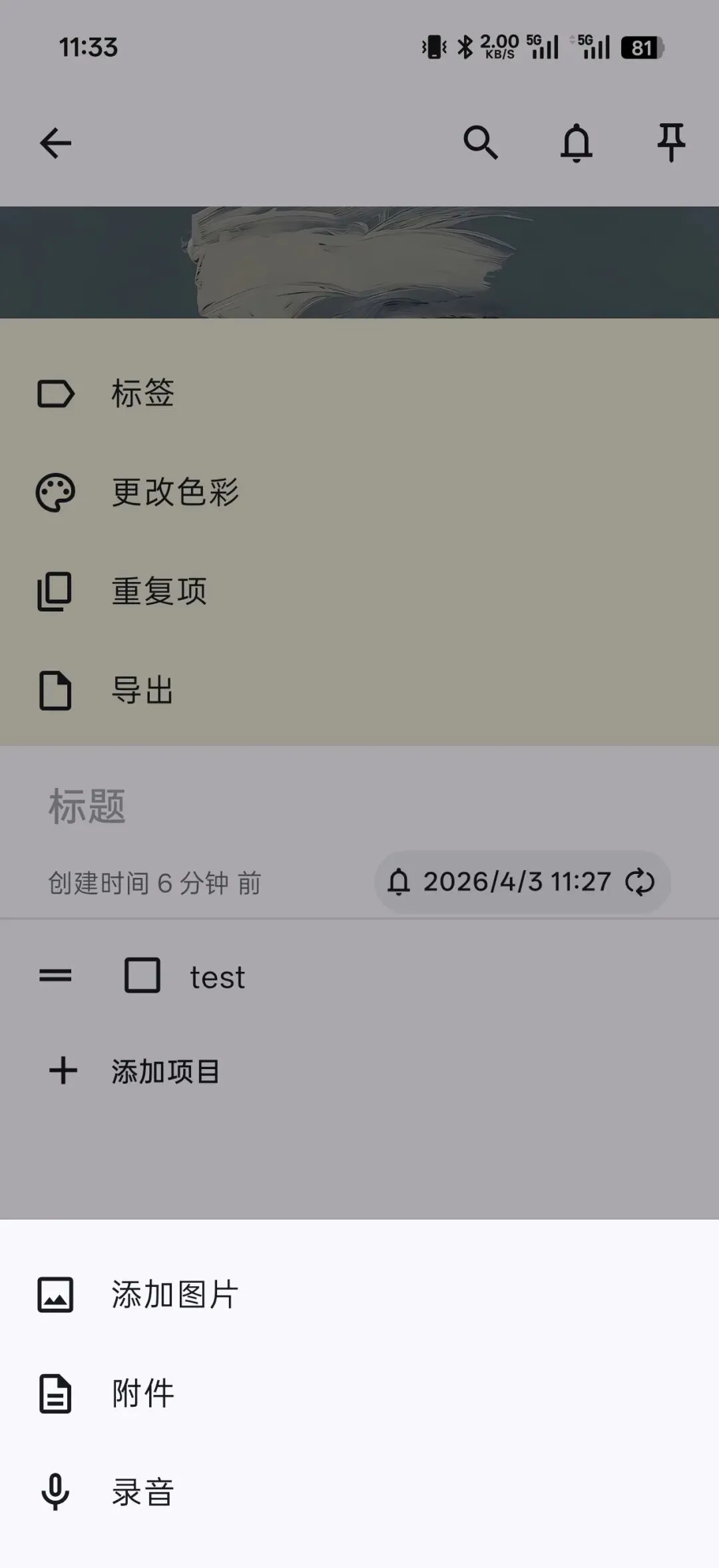 它的笔记功能支持添加附件、图片、录音等。点击右下角的三个点可以导出笔记、自定义页面颜色: