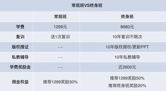 答:终身班提供MBTI解析师版权授权,以及私教辅导服务,终身不限次复训权益,常规班没有这些内容。终身班目前学费8980元,常规班学费1299元。