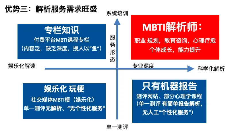 答:MBTI解析需求旺盛,满足了市场未被满足的深度,专业服务。市场上普遍存在的是浅显的测评服务,缺乏深度,个性化专业解析服务,以解决职业发展,个人发展中的重要问题。
