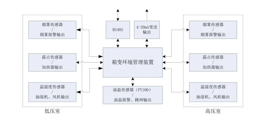 本装置实时采集变压器油温、 环境温湿度、 露点、 烟雾等传感器/探测器数据信息; 如遇异常情