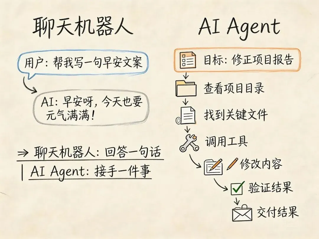 Chatbot 是在回答一个问题,Agent 是在接手一件任务。