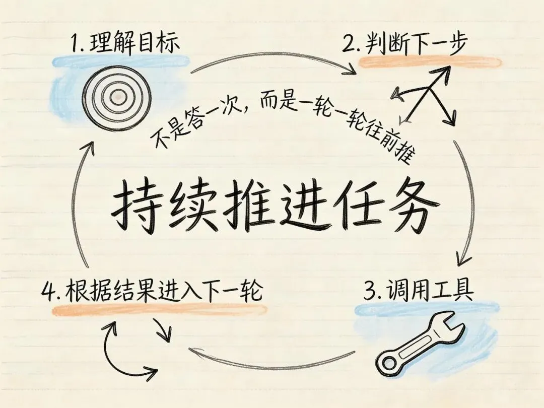 翻译成人话,其实就一句:Agent 不是答一次,它是在一轮一轮往前推。