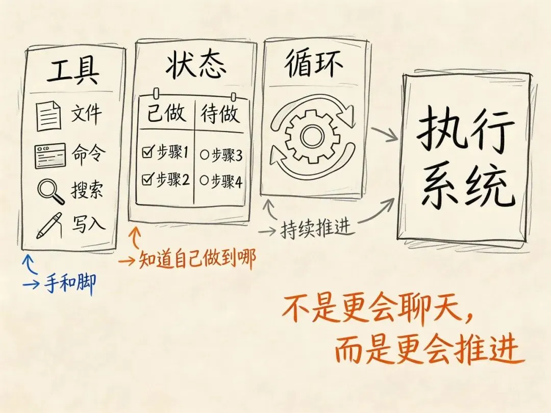 工具解决的是「能不能动手」,状态解决的是「知不知道自己在哪」,循环解决的是「能不能把事情持续往前推」。少一个都不行。