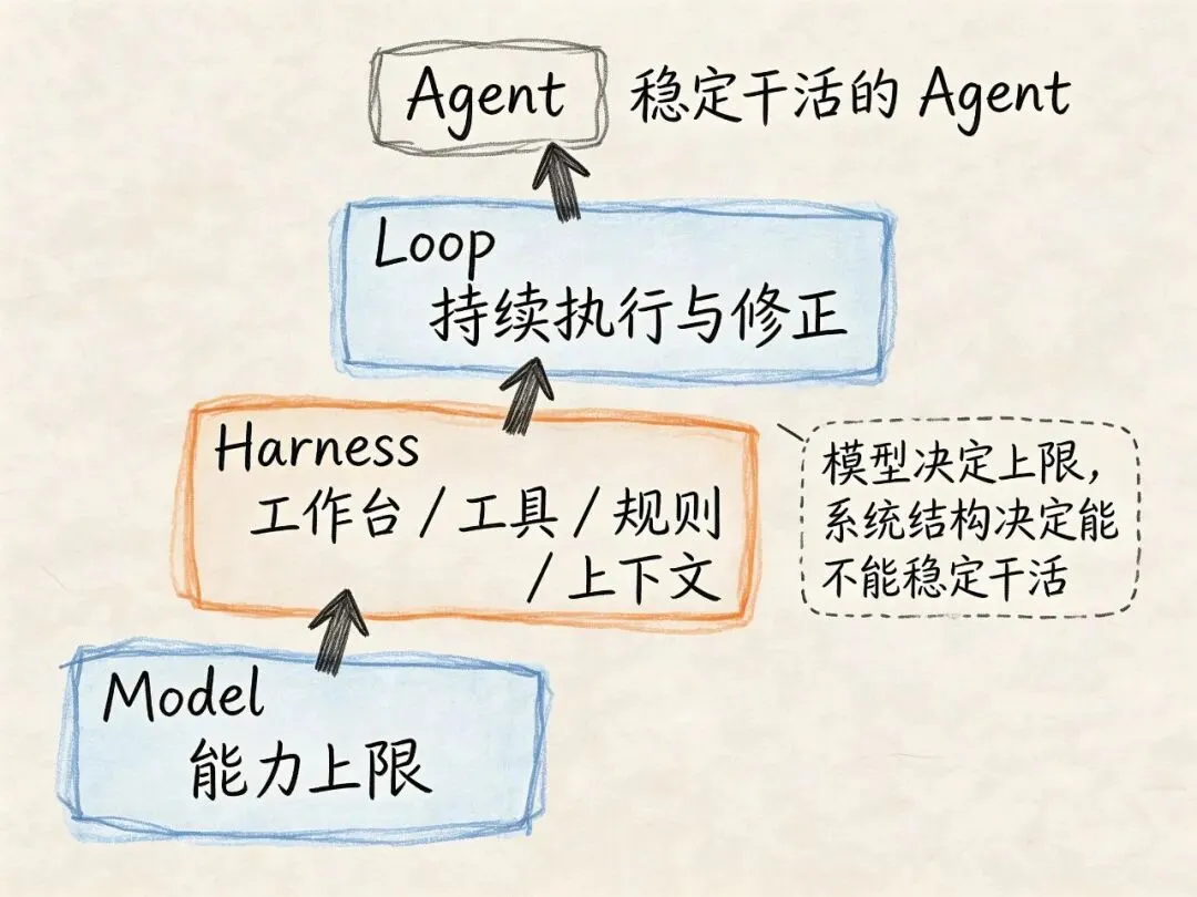 模型决定能力上限,harness 决定它有没有工作台,loop 决定它能不能真的把任务往前推。