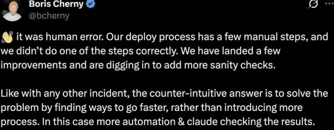 毕竟这是一个严重人为错误,打包人员太不小心了,从Claude Code之父的回复可以看出来:it was human error。