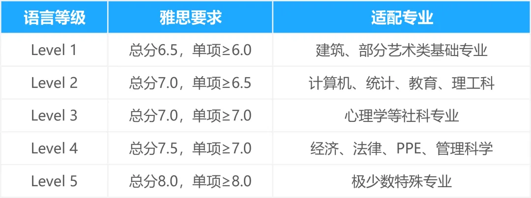 UCL语言成绩有效期为入学前2年,2026年9月入学需2024年9月后考取的成绩,分为5个等级,热门专业普遍集中在Level2-Level4: