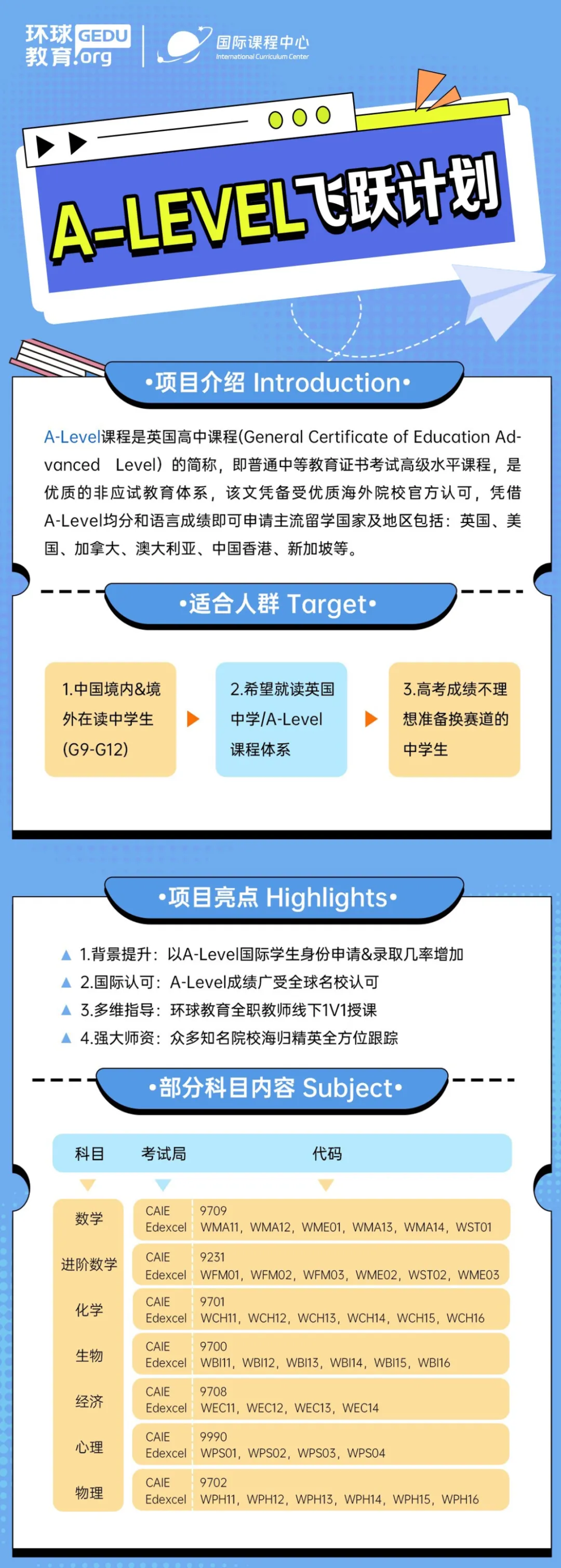 A-Level飞跃计划,专门为目标世界名校的同学准备,学生可以选择一年制或两年制课程,系统性学习英国A-Level课程体系,并同步提升语言成绩,在2026/2027年进入梦想大学。
