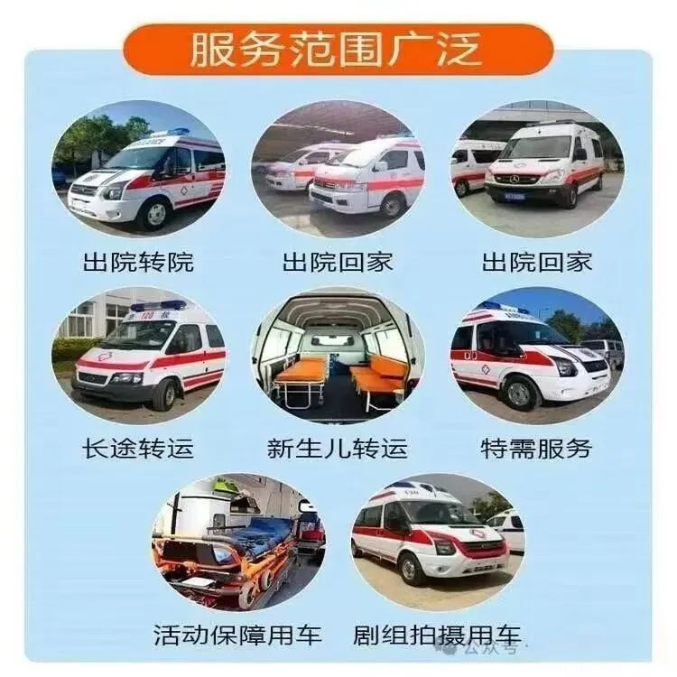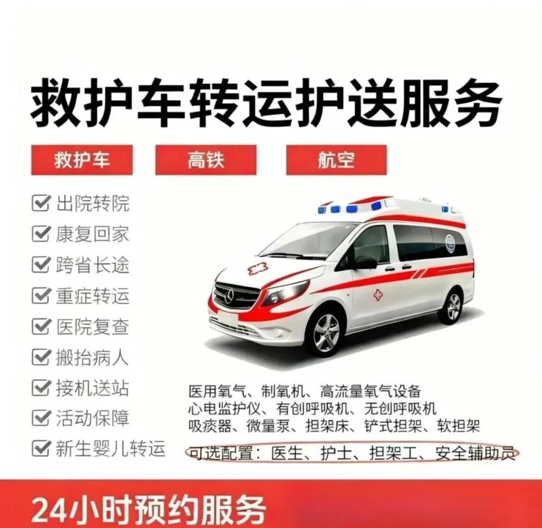 我们是救护车出租转运公司,120救护车接送病人预约护送。24小时为术后康复、危重患者及跨区域就医人群提供专业医疗转运服务,提供120救护车出租‖救护车转运‖私人120救护车(非急救)‖跨省长途转运‖危重病人转运‖市内转运‖术后康复病人转运‖高铁病人转运‖患者返乡‖大型活动赛事保障‖配备ICU设备:呼吸机▪心电监护仪▪吸痰器•微量泵•氧气▪急救药箱▪专业医护团队