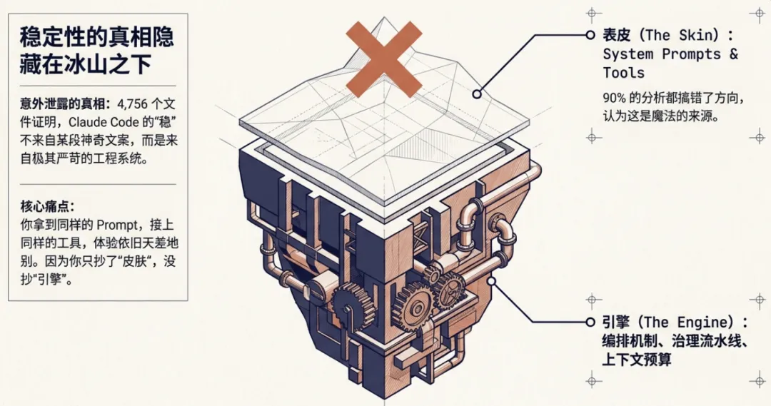 但这两件事,只是这个系统的”皮肤”。你拿到同样的 prompt,接上同样的工具,照着写一遍,出来的东西和 Claude Code 的体验差距会非常大。