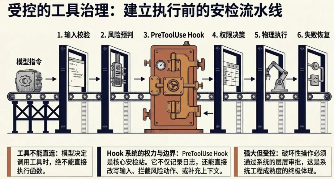 输入校验 → 风险预判 → 权限决策 → Hook 拦截 → 执行 → 记录分析 → 后处理 → 失败恢复