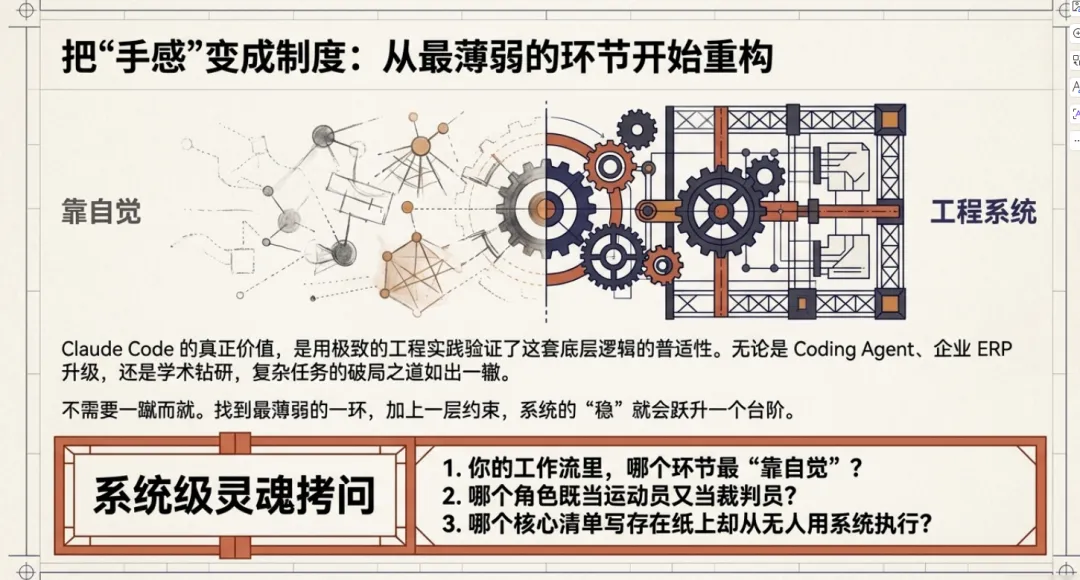 你的工作流里,哪个环节最”靠自觉”?哪个角色既当运动员又当裁判员?哪个清单写了但没人执行?