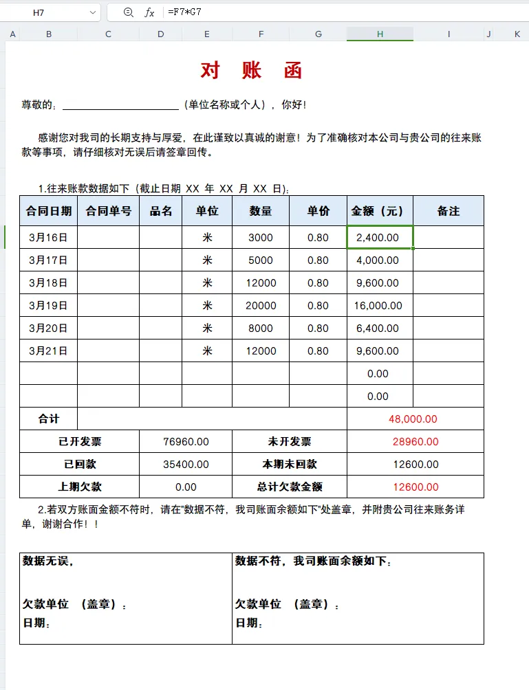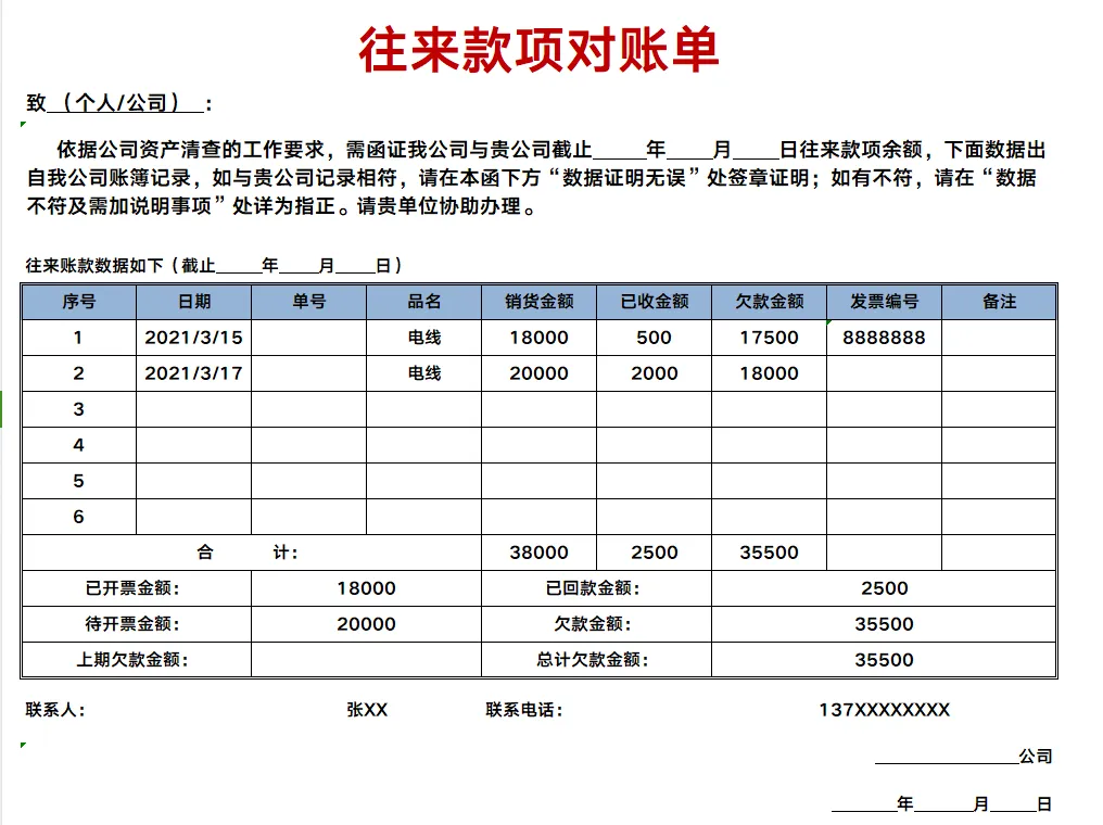 往来款项对账单