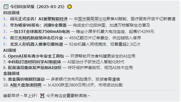 【AI领域】OpenAI发布新模型,上下文窗口再翻倍… 【科技动态】苹果或放弃造车,转向生成式AI… 【金融要闻】央行最新定调,释放宽松信号… (共10条,每条包含:核心摘要+发布日期+原文链接)