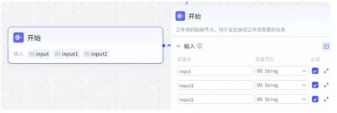 第一步:指挥部(开始节点)这里就一个任务:设置一个输入变量,比如叫 keyword。这就是你给侦察兵下的命令。以后你只需要在这里填“AI”、“半导体”或“新能源汽车”,它就知道该去搜什么了。