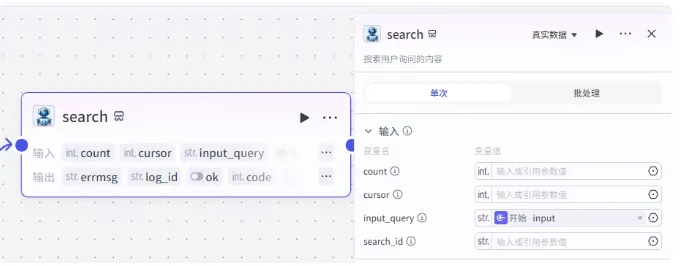 第二步:侦察部(头条搜索节点)在插件市场搜索“头条搜索”,添加进来。把上一步的 keyword 变量,喂给这个插件的 query 参数。这就相当于派出了一个训练有素的侦察兵,直奔今日头条,搜索你指定的关键词,并把最新的20条结果打包带回。