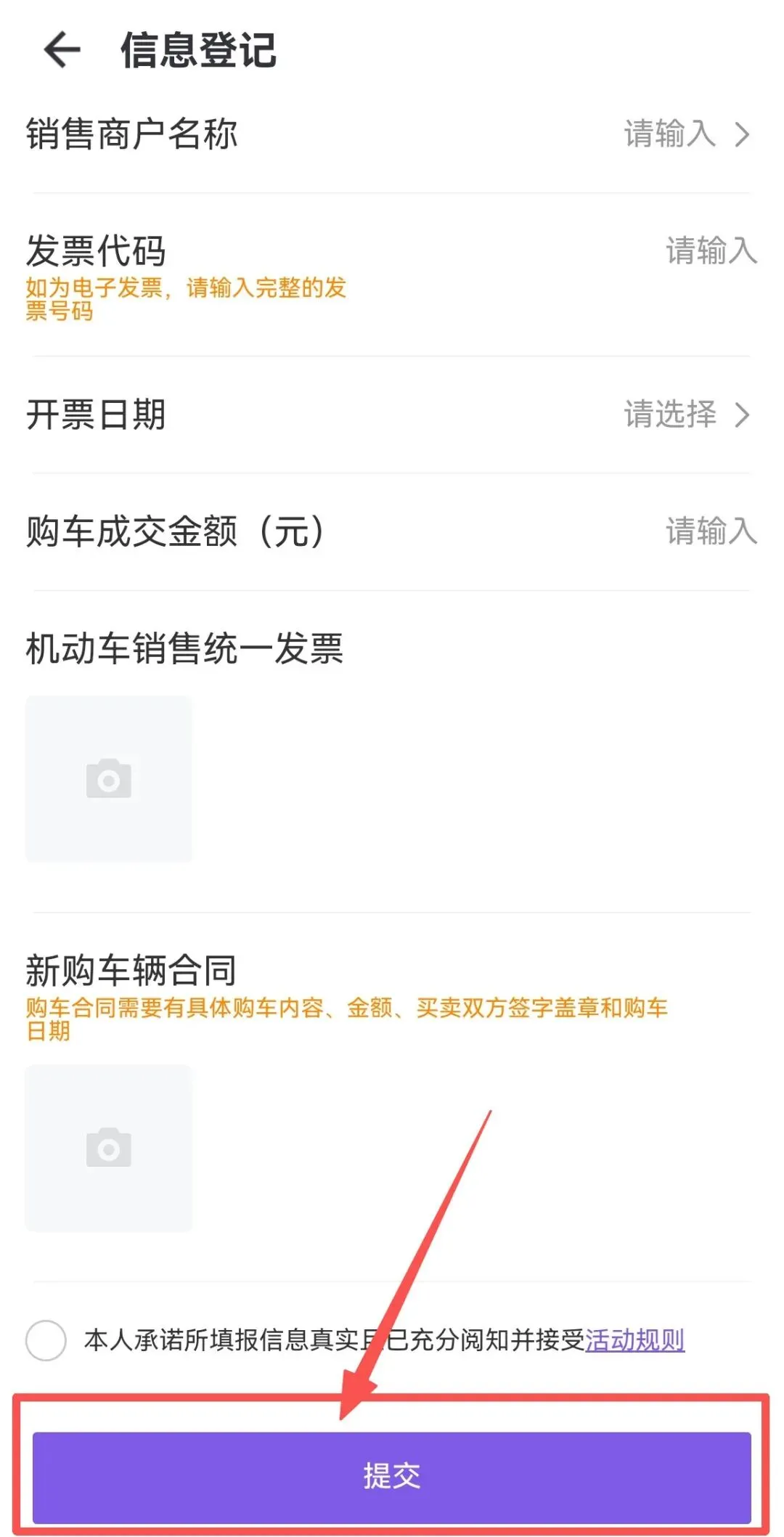 个人消费者新购车辆,《机动车销售统一发票》开具和新车注册登记日期需在活动期间(即开票、上牌均在2026年3月21日至活动结束期间)。发票开具单位应是活动商户,发票抬头、行驶证车主为申领补贴的消费者本人,车辆使用性质登记为“非营运”且为小型、微型载客汽车。