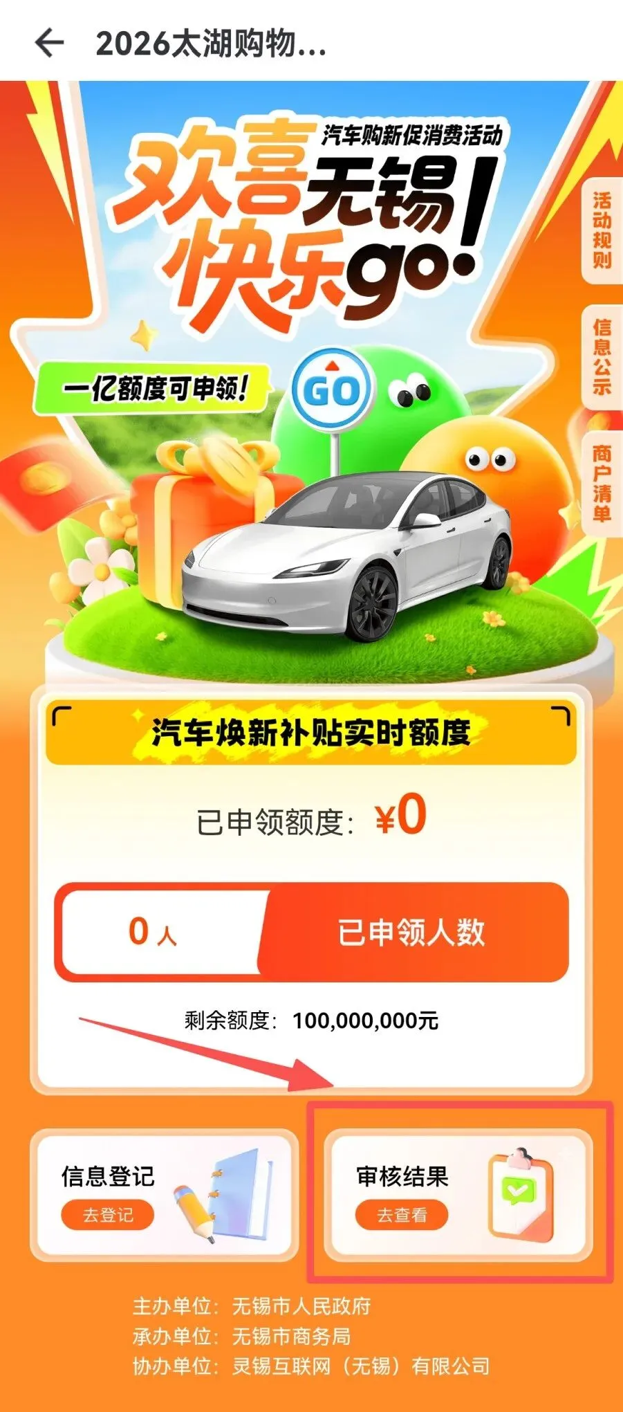 由汽车销售企业注册所在地的商务局委托专人对申请材料进行审核,审核期限一般为30个工作日,审核结果在灵锡App申领页面显示(“审核通过”“退回修改”或“审核不通过”),并以短信形式发送补贴申请人,因故未收到短信的申请人可通过活动页面自行查看审核结果。“退回修改”的,补贴申请人需及时完成补充修改,提交后重新排序审核。未在限期内提交符合要求相关材料的个人消费者,视为放弃申领补贴。审核后,将由相关部门进行统一核验,核验异常取消活动资格。
