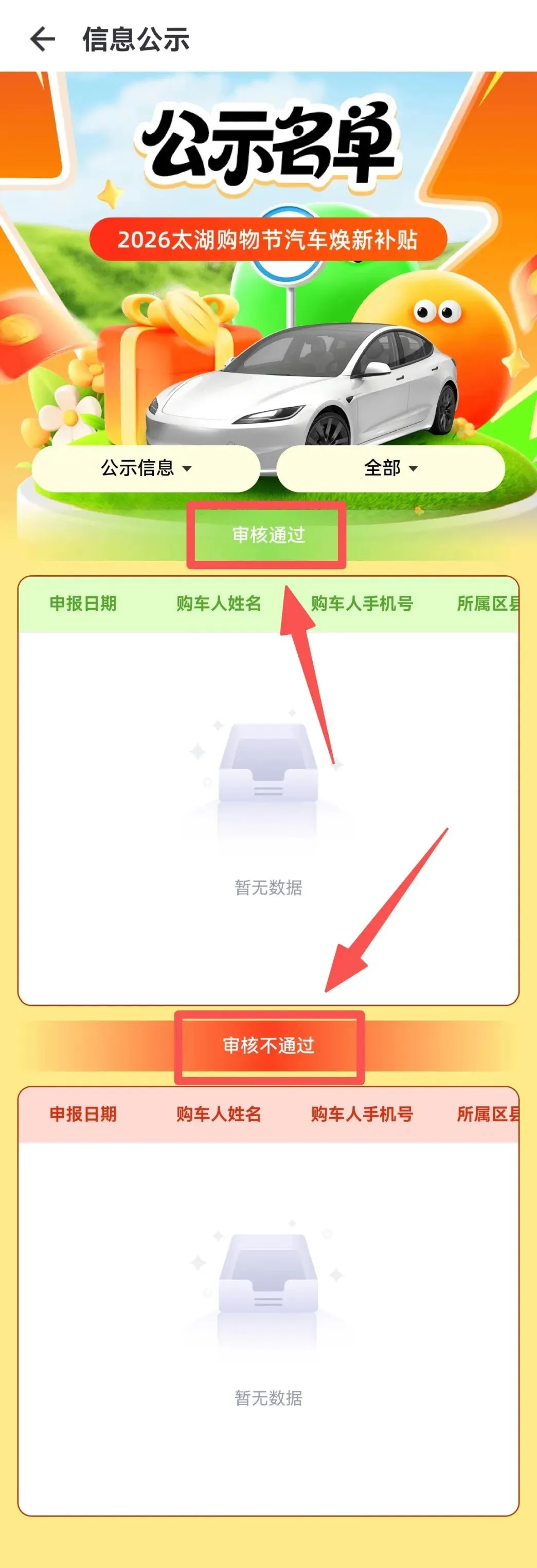 审核通过的补贴申请人名单分批在灵锡App公示(每批公示期为7天),消费者可登录申领页面查看公示结果。名单内公示有异议的人员,另行组织专门审核;“审核不通过”且公示期间未提出异议的,后续不再受理。