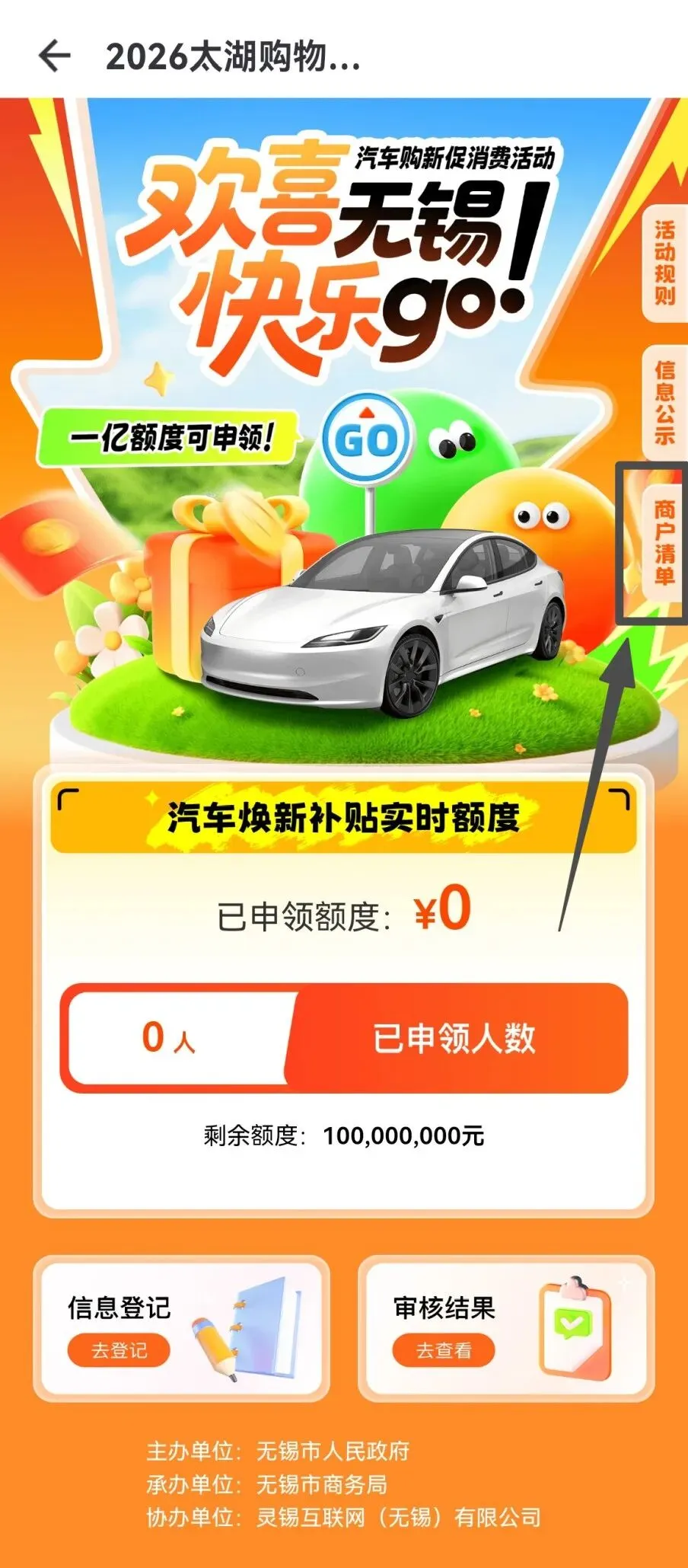 您可在【2026“欢喜无锡 快乐go” 汽车购新补贴活动】页面,点击右侧边的【商户清单】滑动查看具体内容。