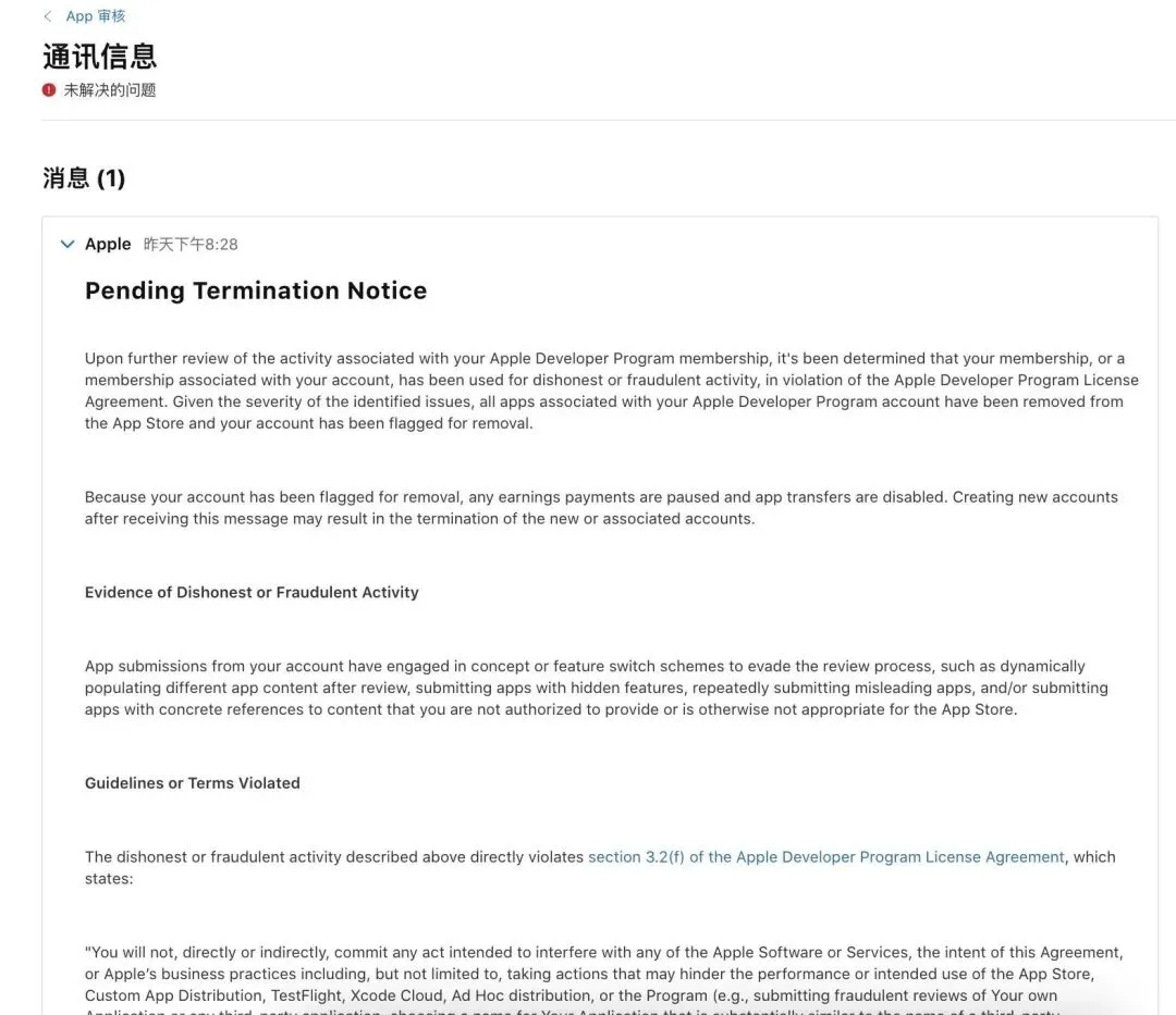 很多iOS开发者都会遇到App长时间处于等待审核状态,但你可能不知道:界面显示审核中,不代表一切正常,苹果可能早已给你的账号下发了“待终止通知”。