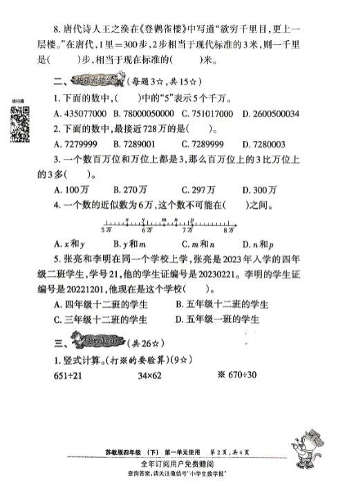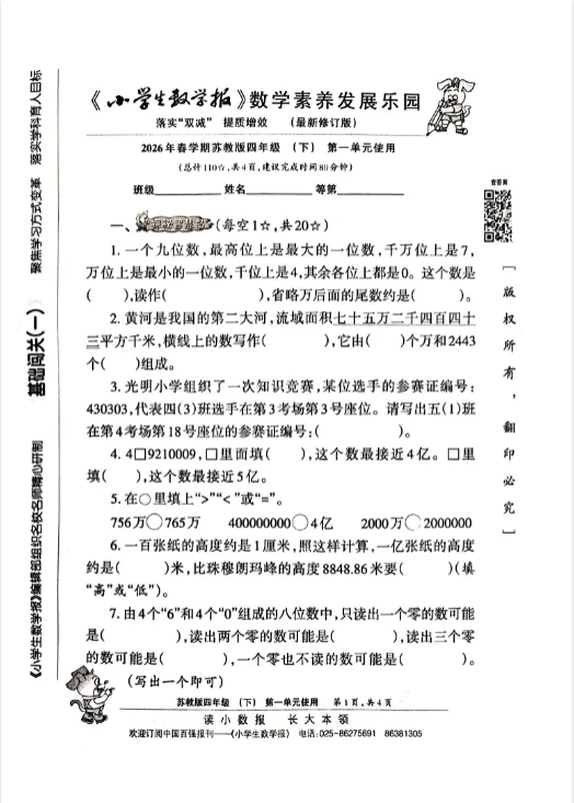 本期分享:26春《小学生数学学习报》四年级下册,如果觉得不错的话,可以转发分享到班级群/年级群,让家长打印出来,帮助孩子学习哦!
