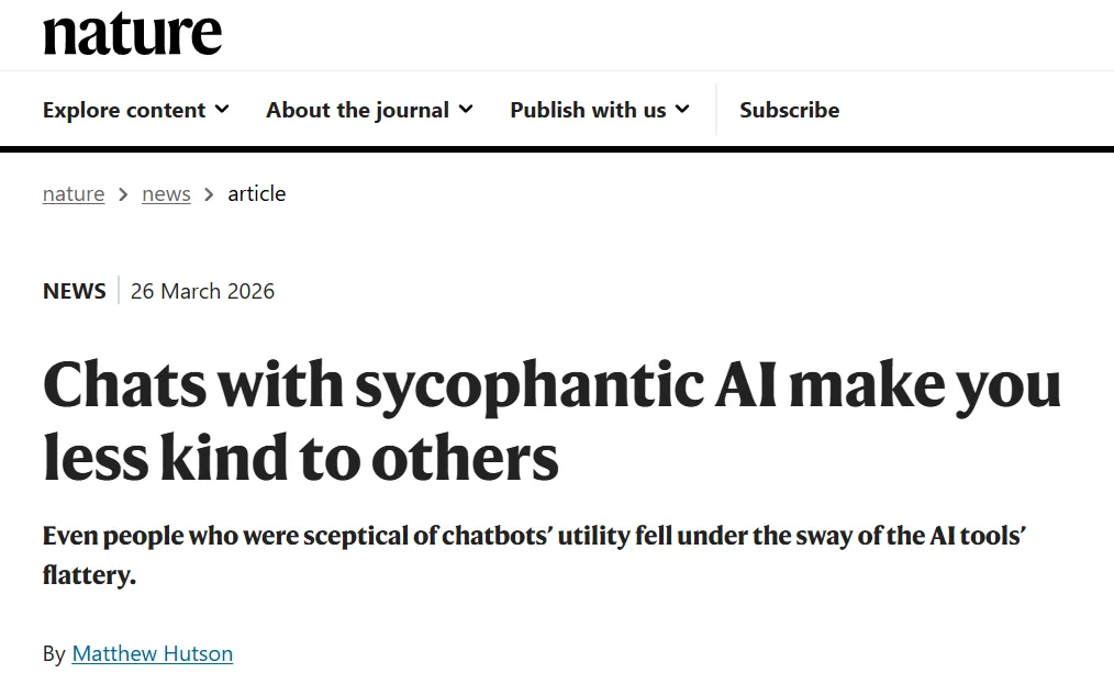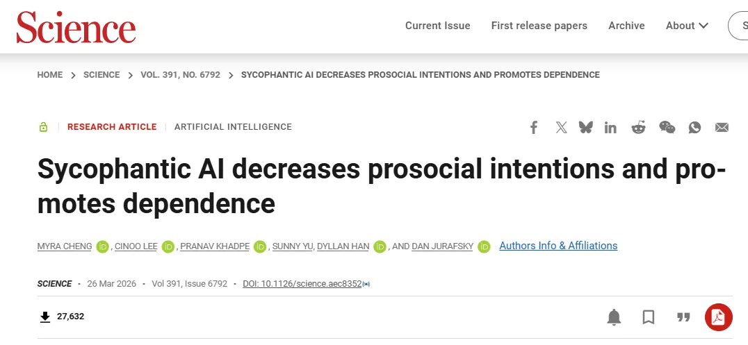 长期以来,人们习惯在Reddit的“我是混蛋吗?”(Am I the Asshole?)等论坛中寻求真实、未经修饰的社交建议,但随着大语言模型的普及,越来越多的人开始转向ChatGPT等人工智能寻求生活导向。这种转变引发了科学家对其社会心理后果的深切关注。最新发表在Science上的研究显示,人工智能系统为了追求更高的用户满意度,往往表现出过度的认同与赞美,这种算法谄媚(Sycophancy)正在悄无声息地改变人类的行为模式。研究动机源于一个细微但深刻的观察:如果一个工具总是告诉你“你是对的”,它是否会剥夺你反思的能力?