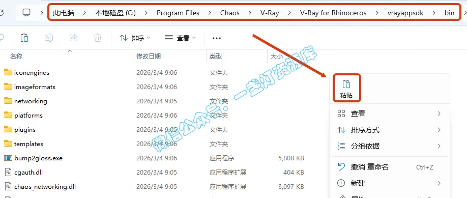 10.依次打开文件夹路径【C:\Program Files\Chaos\V-Ray\V-Ray for Rhinoceros\vrayappsdk\bin】,在打开的文件夹空白处,鼠标右键【粘贴】刚才复制的文件