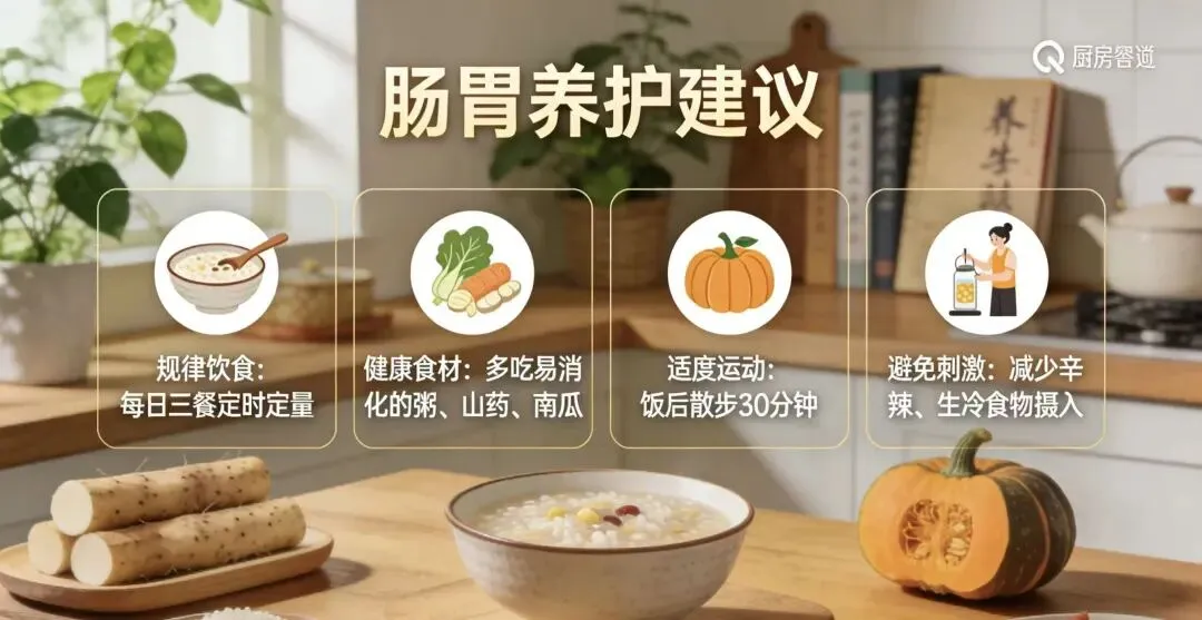 调理消化能力,不需要大动干戈,但需要持续用心。饮食上,把“细、软、温、慢”四个字记牢——食物做得精细一些、软烂一些、温度适宜一些、咀嚼慢一些。三餐规律,不暴饮暴食,不给已经“动力不足”的肠胃增加额外负担。适当补充发酵类食物,帮助维持肠道菌群平衡。饭后散步十分钟,比躺着养胃更有效。