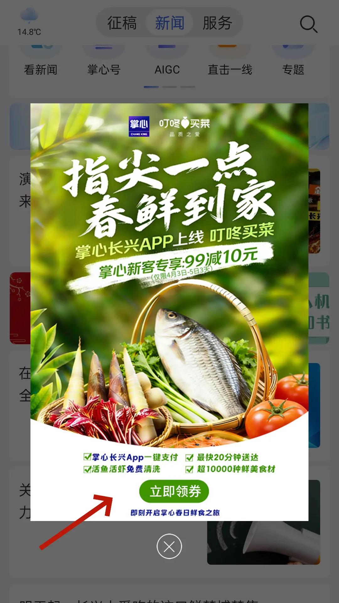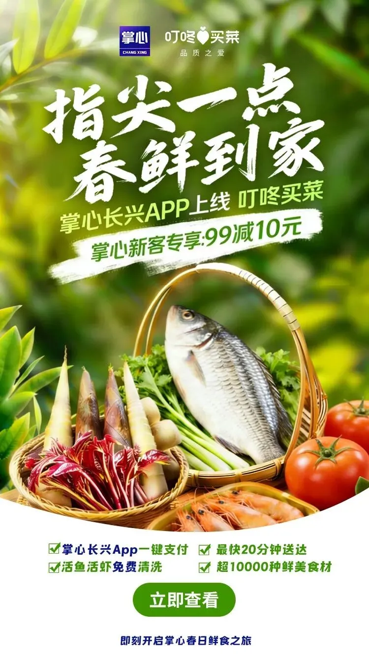 春鲜送到家!掌心长兴APP上线叮咚买菜,99-10元专属优惠券限时领