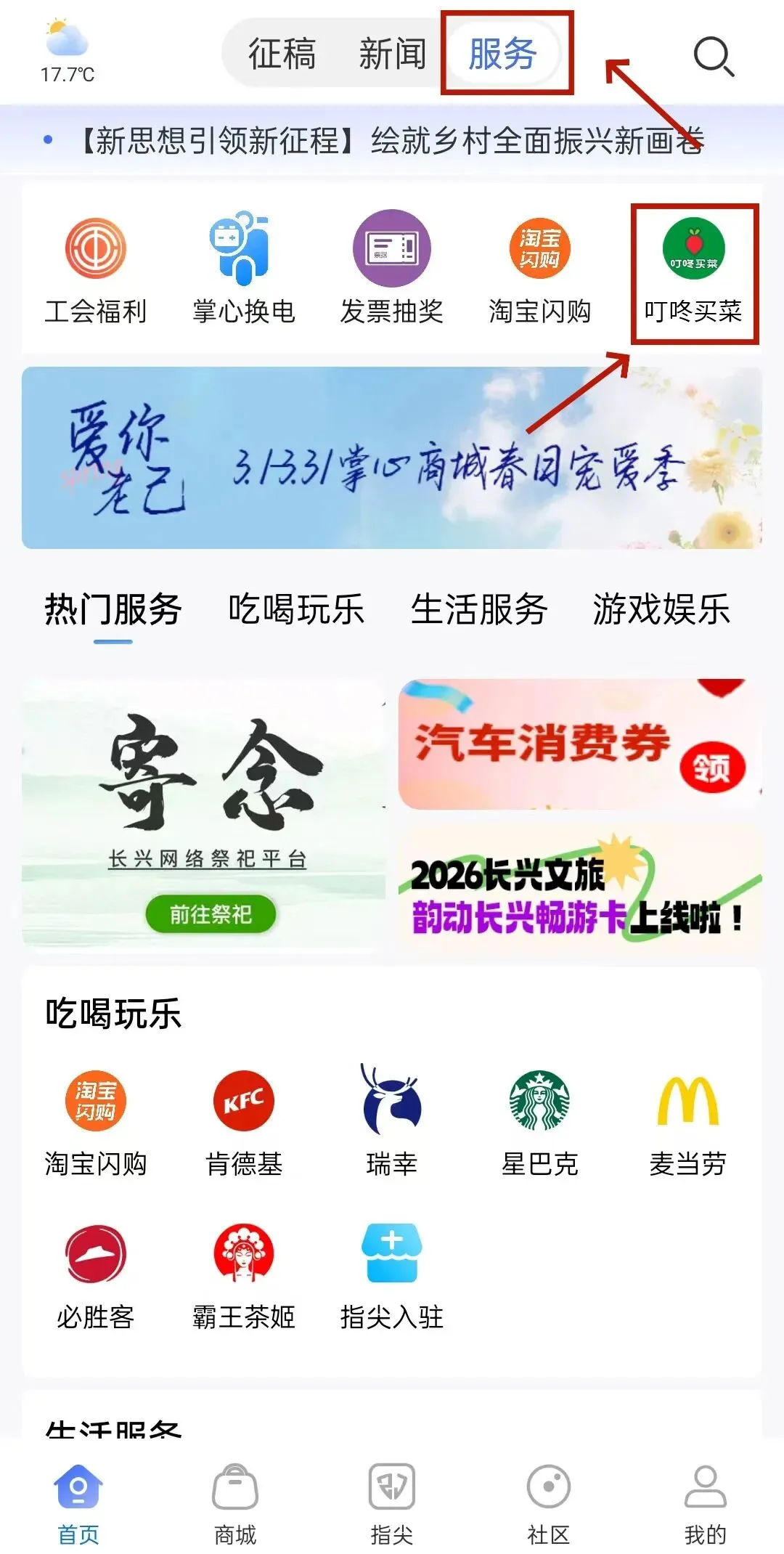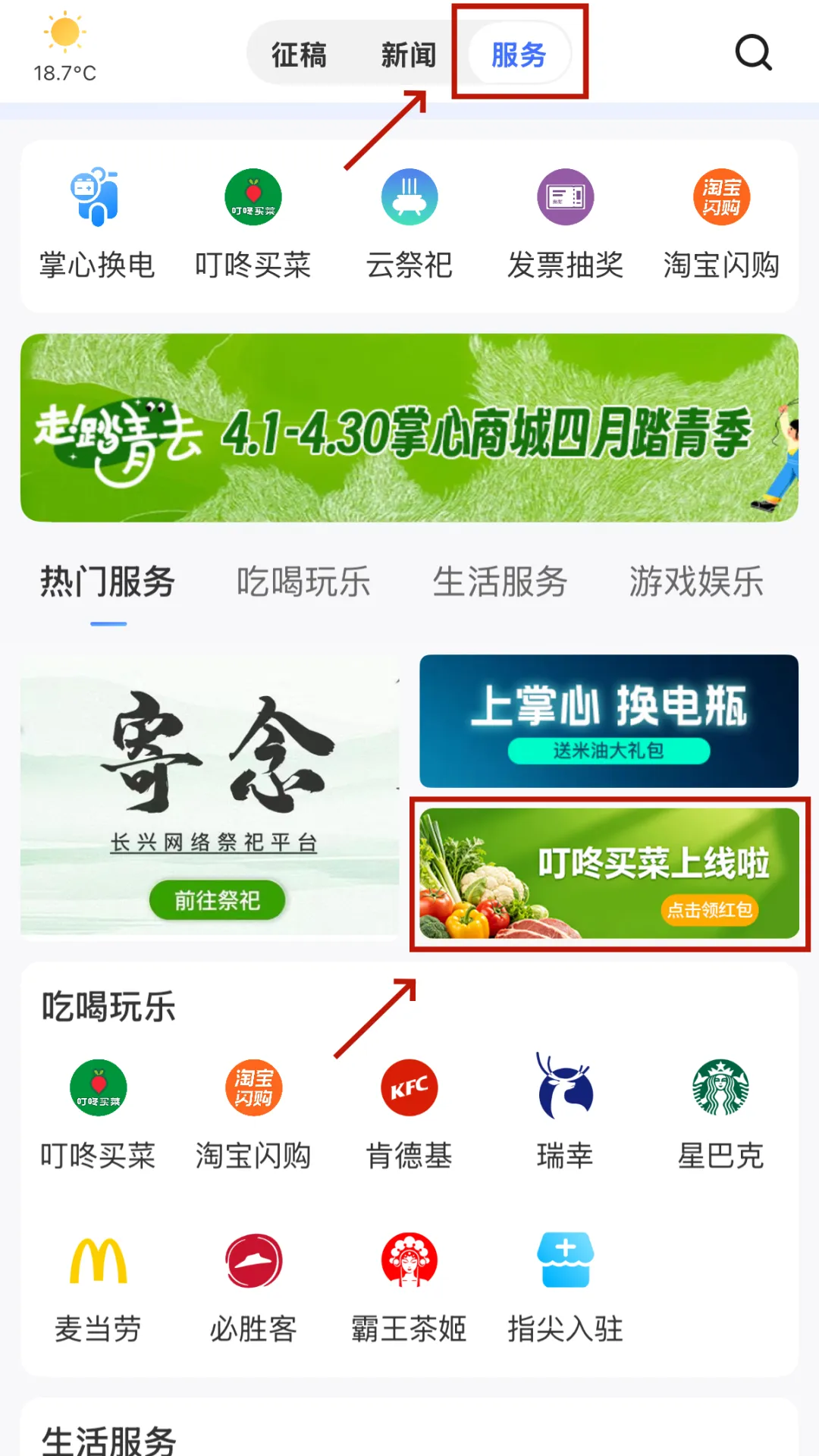 注意:领取完优惠券后,需要退出页面,前往“首页-服务-叮咚买菜”,在「叮咚买菜」应用内才可使用~
